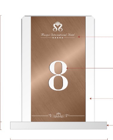 大家可以看到這個酒店餐臺座,簡單的給大家介紹下制作規范:牌上面印有酒店logo是采用絲印銀色,牌上的序號數字制作材質是用3mm厚斜紋細拉不銹鋼,工藝上電鍍咖啡金色、文字鏤空、打磨拋光,亞克力底座使用打磨拋光制成??梢粤私獾揭粋€小小餐臺座設計師也是很用心為酒店設計制作的,不僅僅要讓酒店滿足還要讓更多的客戶喜歡。
