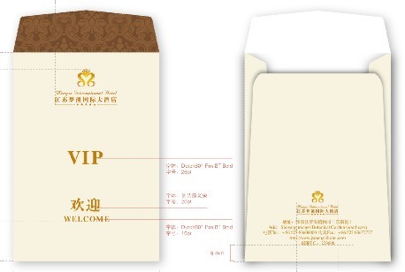 酒店所用制的貴賓卡封套,主要用途是將酒店VIP卡進(jìn)行貼切的包裝,可保護(hù)貴賓卡的表層,封套的風(fēng)格設(shè)計與酒店形成統(tǒng)一風(fēng)格,將一份精心包裝后的貴賓卡送至客人手中,讓顧客感受到酒店的用心與貼切。同時,也傳達(dá)了酒店僅在一個貴賓卡封面的設(shè)計也是花費了很大用心與精力去制作的,讓每一位客人感到酒店溫馨貼切的服務(wù),酒店也會在眾人眼前表現(xiàn)出最好最優(yōu)質(zhì)的服務(wù)形象!